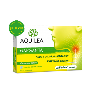 Aquilea Garganta, es un producto sanitario que contiene Fitohial®, un complejo molecular a base de Grindelina, Salvia y ácido hialurónico que calma el dolor de garganta gracias a la formación de un film protector mucoadherente. Además, este film forma una barrera que protege la garganta y la mucosa orofaríngea de los agentes externos. Aquilea Garganta contiene también própolis y aceites esenciales de clavo y naranja.