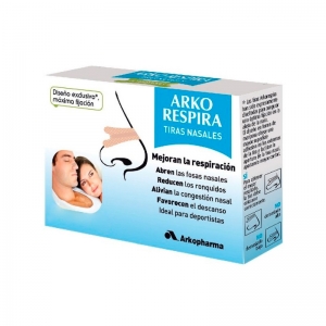 Las tiras nasales Arko Respira abren los conductos nasales mejorando el flujo de aire y por lo tanto, la respiración. Como resultado, reducen los ronquidos, mejorando el descanso, alivian la congestión nasal y mejoran la respiración de los deportistas. Modo de empleo: - Lavar y secar la humedad de la nariz para eliminar la grasa facial o el maquillaje. - Retirar el papel protector a medida que se aplica la tira para que quede sobre el puente de la nariz. No tocar la superficie adhesiva. - Colocar la parte de la tira más larga hacia abajo. - Frotar suavemente para fijarla. - Para retirar la tira, hacerlo lentamente. - En caso de deportistas, ponerse la tira 30 minutos antes de empezar el ejercicio físico para mejorar su fijación. Disponibles en tamaño medio y grande.